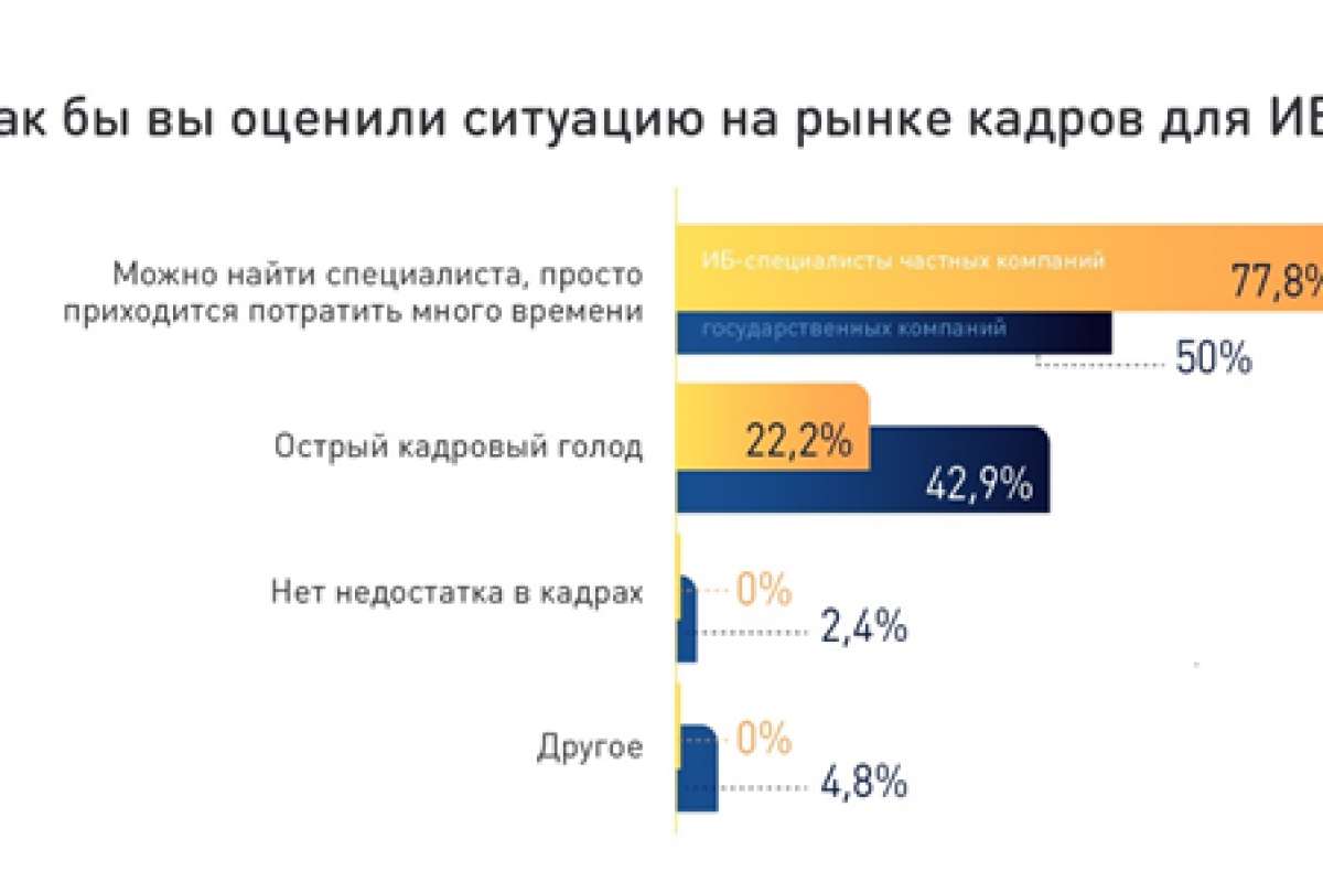 В анкетировании приняли участие представители государственных и частных компаний. Судя по опросу, ИБ-специалистам, работающим в госсекторе, приходится тяжелее — 43% из них говорят об «остром кадровом голоде». Для сравнения в коммерческом секторе так оценивают ситуацию 22% опрошенных.