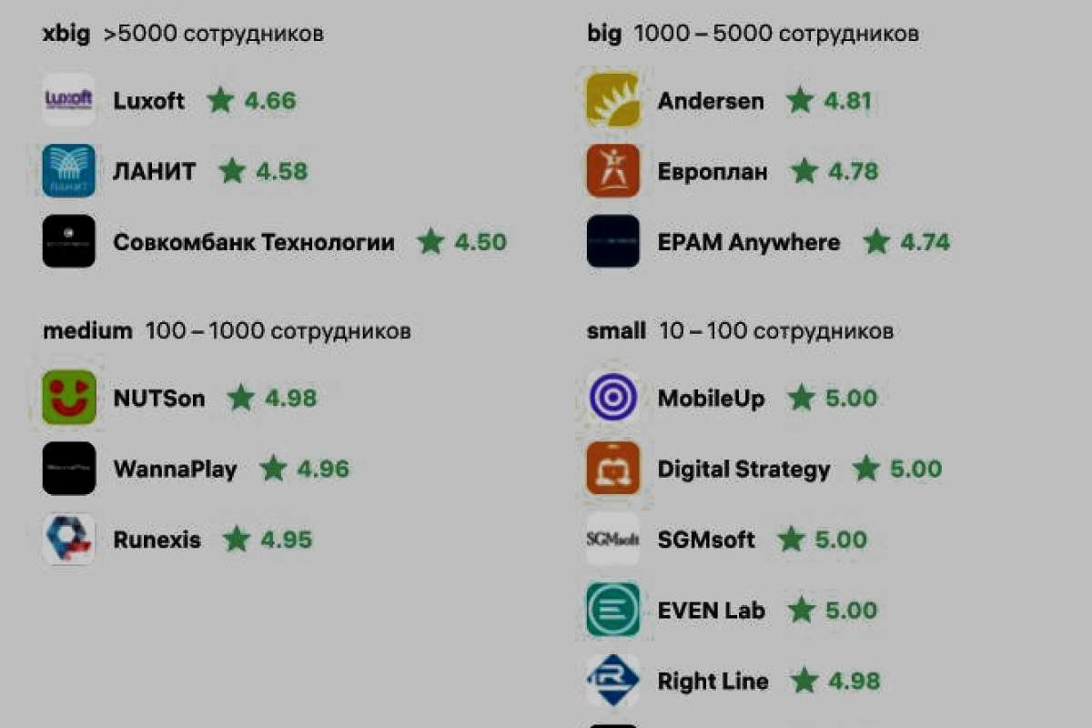 В категории xbig (свыше 5000 сотрудников) победителями Рейтинга-2021 стали ЛАНИТ и «Совкомбанк Технологии». В категории big (от 1000 до 5000 сотрудников) — Andersen, «Европлан» и ЕРАМ Anywhere. В категории medium (от 100 до 1000 сотрудников) — NUTSon, WannaPlay и Runexis. А в категории small (от 10 до 100 сотрудников) — MobiieUp, Digital Strategy, SGMsoft, EVEN Lab, Right Line и HR Prime. Поздравляем победителей!