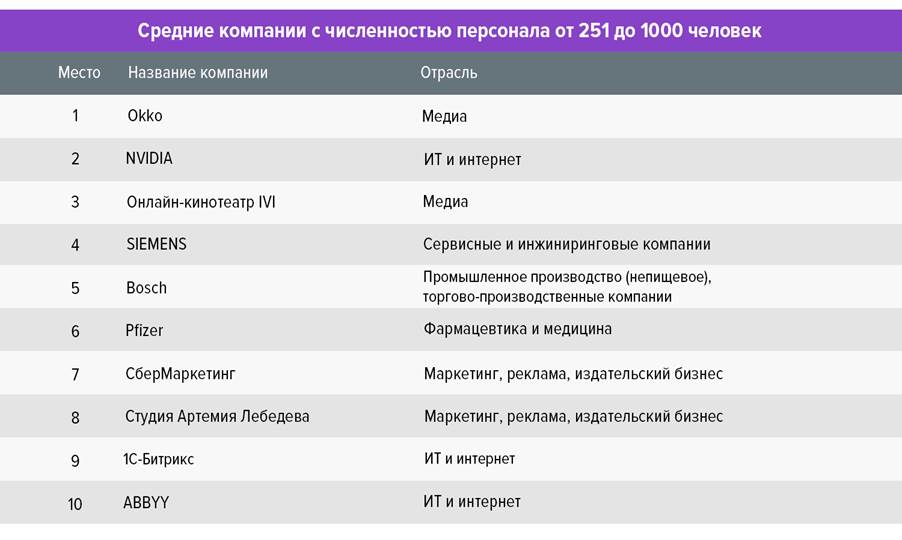 Среди лучших работодателей со штатом от 101 до 250 человек можно встретить компании из разных российских регионов: Санкт-Петербурга, Москвы, Челябинской, Ростовской, Тюменской, Воронежской областей и Республики Карелия. О чем это говорит? Региональные компании выходят из тени и не только следуют HR-трендам, но и сами задают их. Как раз на примере небольших компаний очевидно, что успешность HR-функции зависит не столько от бюджетов, сколько от уровня вовлеченности HR-специалистов в процессы, от системной работы над HR-брендом. GREEN, «Феникс» и «Ситилинк» еще в прошлом году не вошли даже в топ-30, а в этом году показали блестящие результаты.