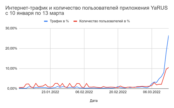Наибольший прирост трафика и пользователей показала российская социальная сеть YaRUS. С 6 марта трафик на приложение резко увеличился — в 2,4 раза по сравнению с днем ранее. В последующие дни трафик все больше набирал обороты: 13 марта его объем стал в 148 раз больше, чем в этот же день в январе.