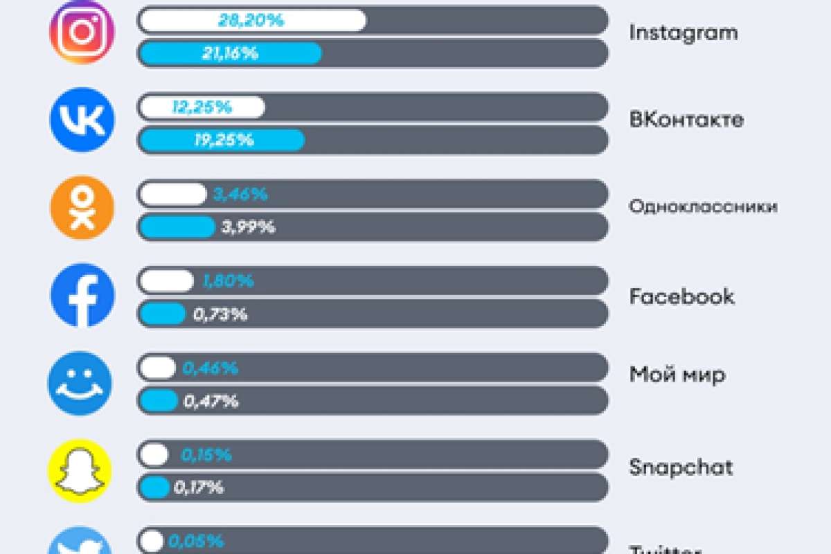 В данные для аналитики вошли пять зарубежных и пять российских соцсетей. Tik Tok, Instagram, Facebook, Snapchat и Twitter вошли в список зарубежных. Среди российских: «ВКонтакте», «Одноклассники», «Мой Мир», Yappy и YaRUS.