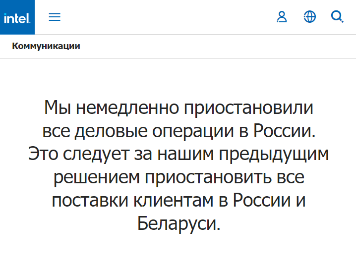 6 апреля 2022 г. Intel опубликовал заявление о приостановке всех деловых операций в России: «Мы приостановили все деловые операции в России. Это следует за нашим предыдущим решением приостановить все поставки клиентам в России и Беларуси.