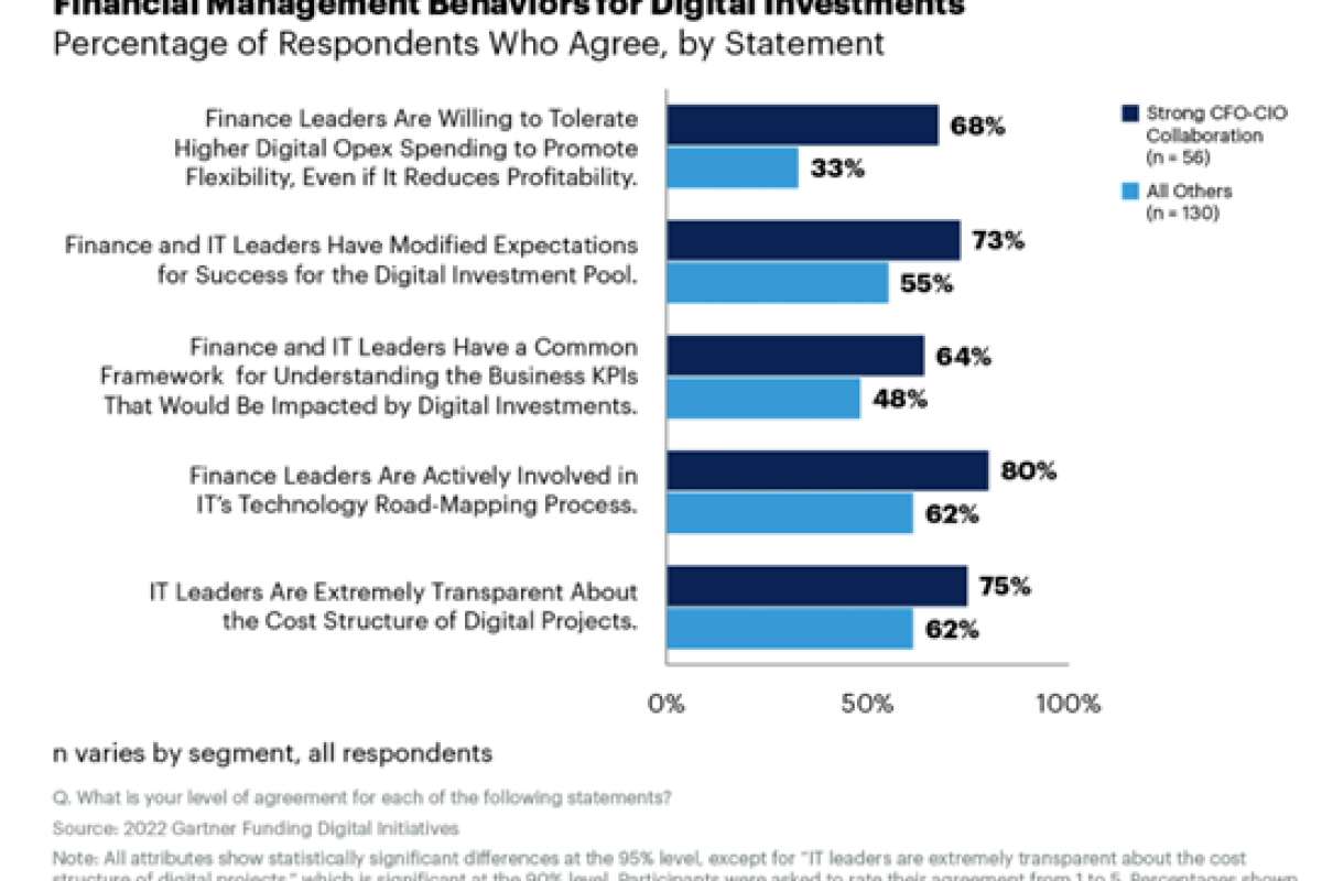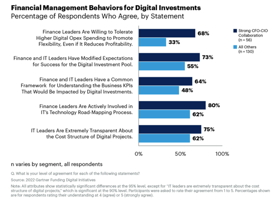 В опросе 183 руководителей, проведенном в декабре 2021 года, отношения глубокого партнерства между финансовыми и ИТ-директорами, приносящие наилучшие результаты инвестиций в цифровое развитие, были охарактеризованы как ориентированные на показатели бизнеса (а не просто на должностные функции) и коллегиальные (а не состязательные).