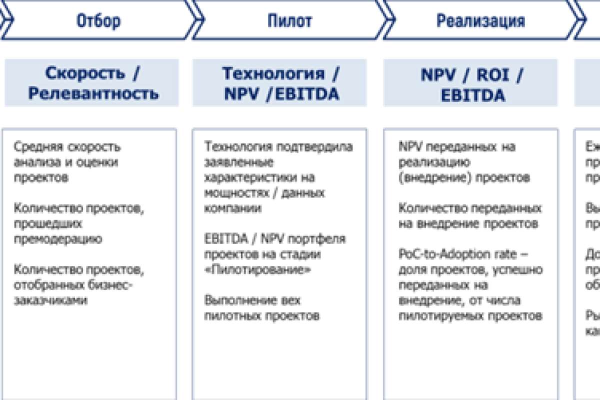 У каждого инновационного проекта индивидуальные показатели эффективности: выдвигается индивидуальная для каждого проекта гипотеза, связанная с ростом продаж, снижением трудозатрат и ростом удовлетворенности клиентов, потом по итогам проекта измеряется его результат. Однако надо не забывать, что главная цель пилотирования инновационного проекта — его завершение в определенный срок и быстрая проверка гипотезы, а не обязательный позитивный результат. Для того, чтобы сотрудники специально «не затягивали» сроки и не тормозили процесс пилотирования проектов, ключевые показатели по работе с инновациями включают в общий KPI департамента и сотрудника. В качестве таких KPI могут служить индикаторы на разных этапах инновационного процесса (Рис. 1).