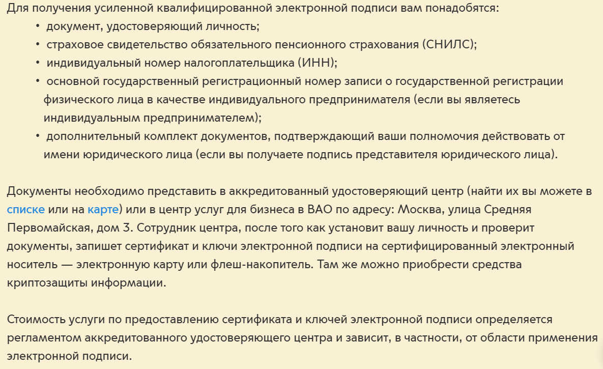 Переходим ко второму пункту: усиленной электронной цифровой подписи. Если нет ЭЦП, выданной центром, аккредитованным Минкомсвязью, то её надо получить (подробнее). Обычно процедура регистрации и получения ключа занимает около недели.