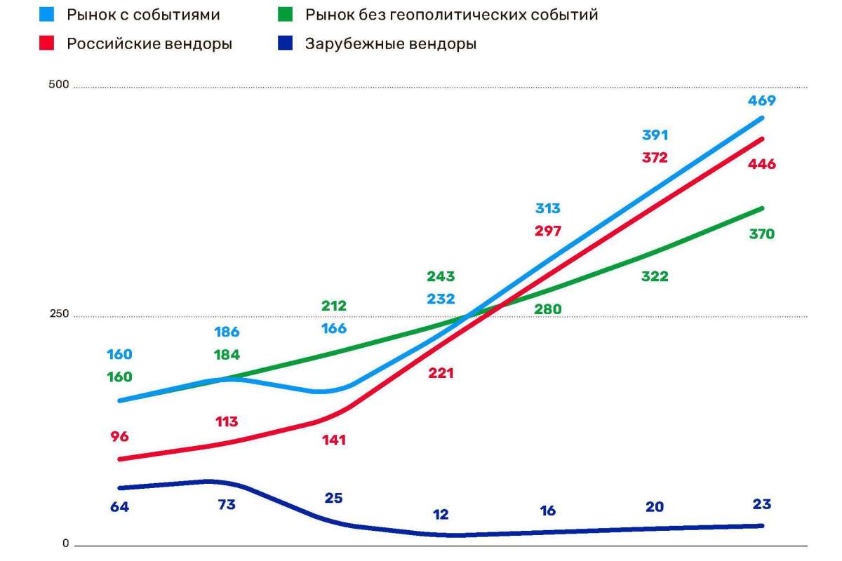 В дальнейшем динамика продаж зарубежных вендоров (в том числе, за счет параллельного импорта) станет слабо-положительной (16, 20 и 23 млрд руб. по итогам 2024, 2025 и 2026 гг., соответственно), а продажи отечественных поставщиков товаров и услуг будут расти по-прежнему стремительно: 290, 372 и 446 млрд руб. по итогам 2024, 2025 и 2026 гг., соответственно).