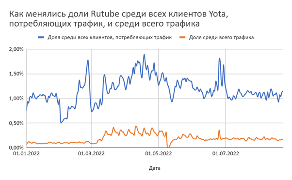 В это время ежедневная доля Rutube среди всех клиентов Yota, потребляющих трафик, колеблется от 0,50% до 1,89%, а в среднем составляет 1,2%. Пика по количеству пользователей российский видеосервис достиг 18 апреля 2022 года, затем почти повторил его 25 июня (1,74%). Однако в течение июля и августа этот показатель был близок к среднему значению.