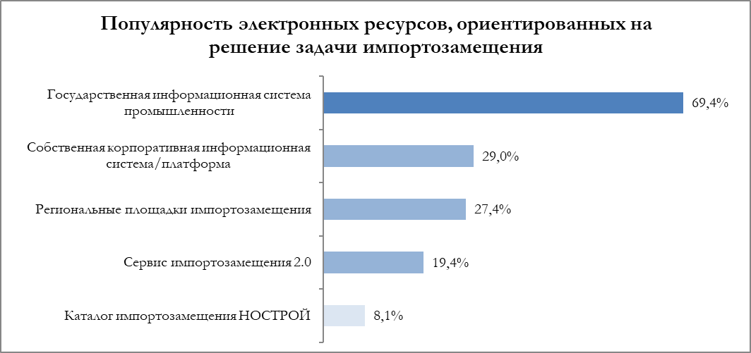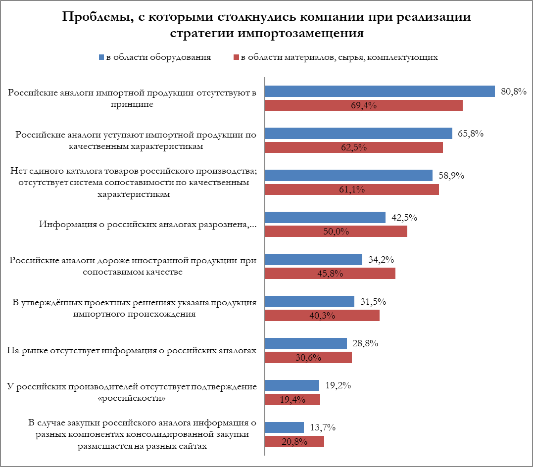 В случае закупки оборудования информация о российских аналогах разрознена, её приходится искать в различных источниках — на большом числе различных сайтов, нескоординированных между собой, по словам 42,5% участников опроса. Половина компаний видят ту же самую проблему при закупке сырья, материалов, комплектующих.