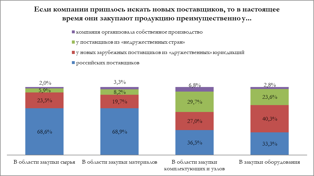 59,3% компаний за прошедшее время нашли новых поставщиков сырья. Если их число принять за 85%, то, согласно результатам опроса, большая часть из них — 68,6% — переключились на российских производителей, а четверть стала закупать нужное им сырьё преимущественно у новых зарубежных поставщиков из «дружественных» юрисдикций.