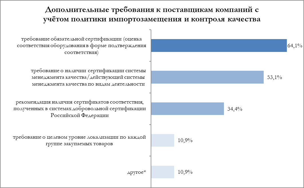 Треть компаний отметила вариант «рекомендация наличия сертификатов соответствия, полученных в системах добровольной сертификации Российской Федерации», и десятая часть из этой группы предъявляет поставщикам требование о целевом уровне локализации по каждой группе закупаемых товаров (максимально допустимом уровне содержания импортных комплектующих).