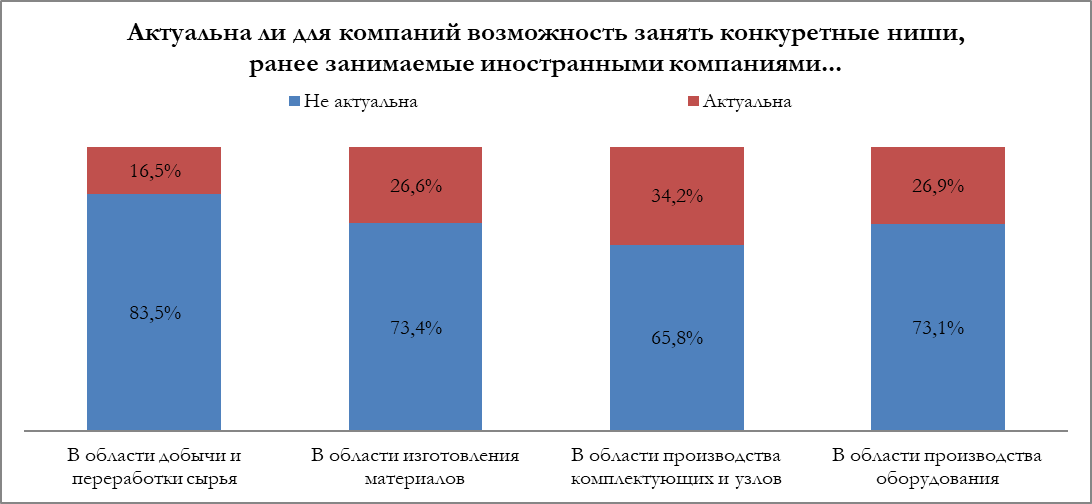 В то же время занять освободившиеся конкурентные ниши в области добычи сырья и комплектующих, на которых ранее присутствовали иностранные компании, хотели бы 16,5% предприятий; в области изготовления материалов и в области производства оборудования их насчитывается уже четверть от общего множества компаний-участниц опроса.
