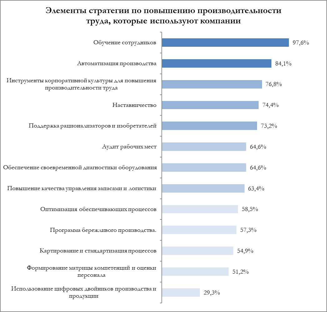Почти все компании ответили, что ведут обучение сотрудников. В 84,1% организаций ведётся работа по автоматизации производства. В трёх четвертях компаний для повышения производительности труда используются инструменты корпоративной культуры; в таком же числе предприятий принята практика наставничества. Так же широко распространена такая форма повышения производительности труда, как поддержка рационализаторов и изобретателей.