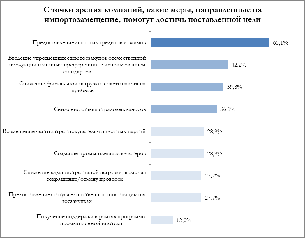 По мнению более двух третей опрошенных, самая эффективная и востребованная мера поддержки, которая поможет заместить импортную продукцию на российском рынке, — предоставление льготных кредитов и займов.