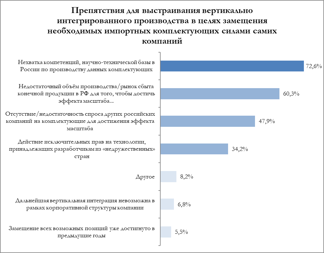 Несколько меньше — 60,3% компаний — видят, что объём производства и рынок сбыта конечной продукции в РФ недостаточно велики для того, чтобы достичь эффекта масштаба в отношении импортозамещающих комплектующих.
