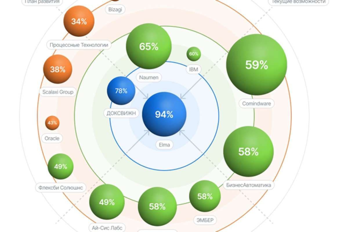 По результатам исследования были названы лидеры с итоговым баллом выше 70 — компании Elma и «Доксвижн». Эти поставщики обладают комплексной функциональностью, готовы к развертыванию своих решений в гибридной инфраструктуре. Компании практикуют «продуктовый подход», т. е. сосредоточены на разработке тиражируемых решений по управлению бизнес-процессами.