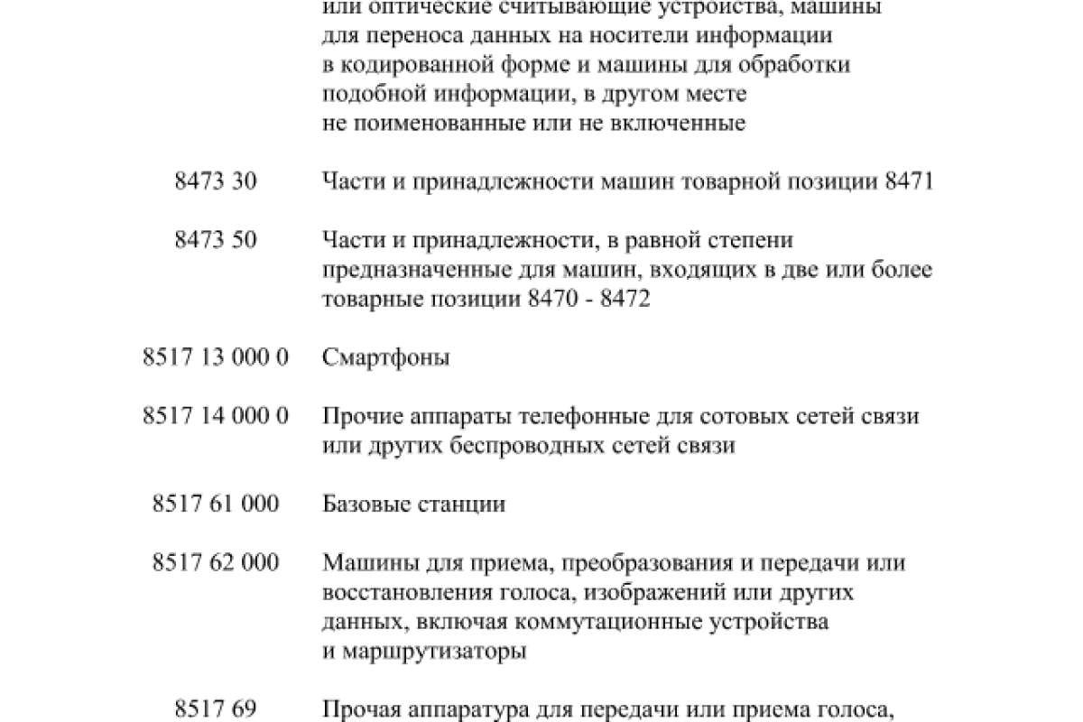 В перечень товаров, в отношении которых таможенные сборы за совершение таможенных операции, связанных с выпуском товаров, уплачиваются по ставке 30000 руб., вошли смартфоны, устройства печати, вычислительные машина и их блоки, мониторы, микрофоны и проч.