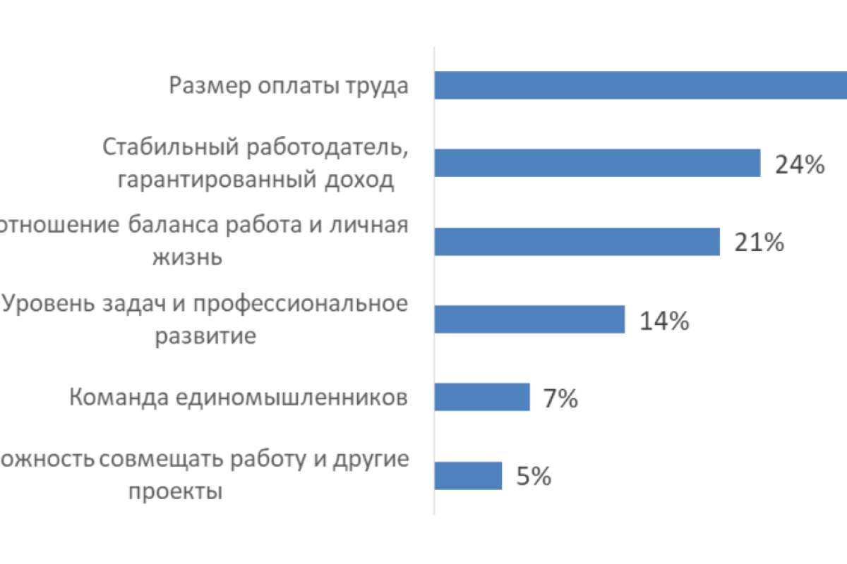 Для 31% опрошенных Ventra ИТ-специалистов важнее всего оплата труда, 24% важны стабильный работодатель и гарантированный доход, 21% выбрали фактор соотношения баланса работы и личной жизни, для 14% важны уровень задач и профессиональное развитие, 7% ценят команду единомышленников, 5% важно совмещать работу и другие проекты.