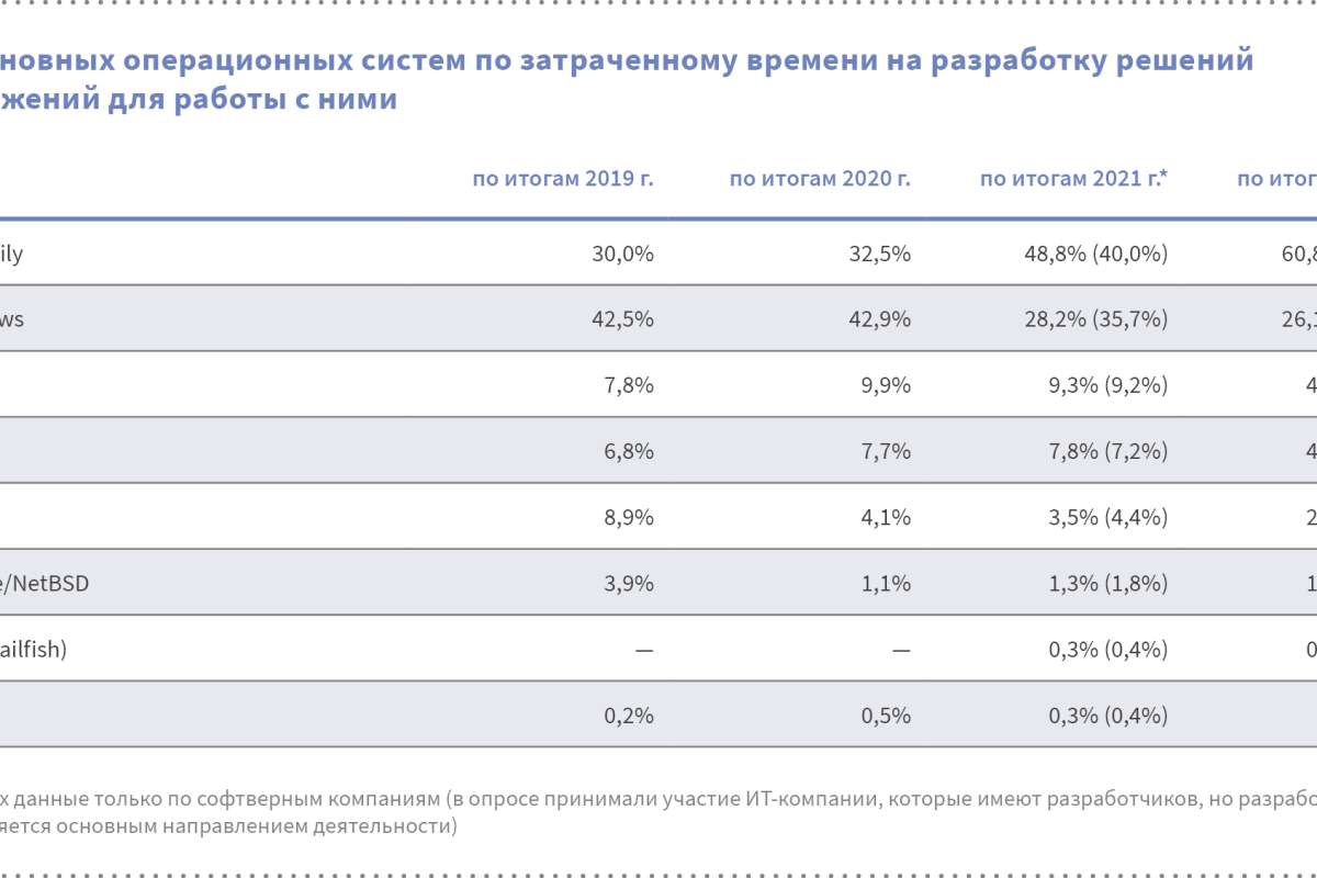 Опрос российских разработчиков ПО в рамках ежегодного исследования софтверной индустрии Ассоциации РУССОФТ показал, что, при оценке популярности операционных систем по затраченному времени на разработку решений и приложений для этих ОС, доля Windows сократилась с 28,2% в 2021 г. до 26,1% в 2022 г. Снижение хотя и незначительное за год, но оно служит продолжением тренда, начатого годом ранее, когда популярность разработки приложений для этой ОС обвалилась с 43% до 28%. К тому же, ещё более увеличилось ее отставание от Linux Family.