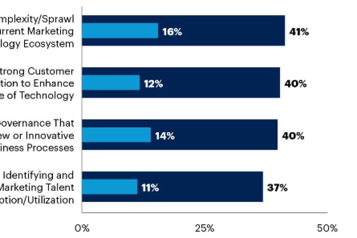 Расширить использование МарТех не так просто: лишь 11% респондентов сообщили, что в 2023 году увеличили использование маркетинговых технологий более чем на 10% по сравнению с предыдущим годом. Сложность сегодняшней экосистемы, вопросы обращения с данными клиентов и негибкость управления в целом названы в опросе главными препятствиями к большему использованию имеющегося арсенала МарТех (см. рис. 1).