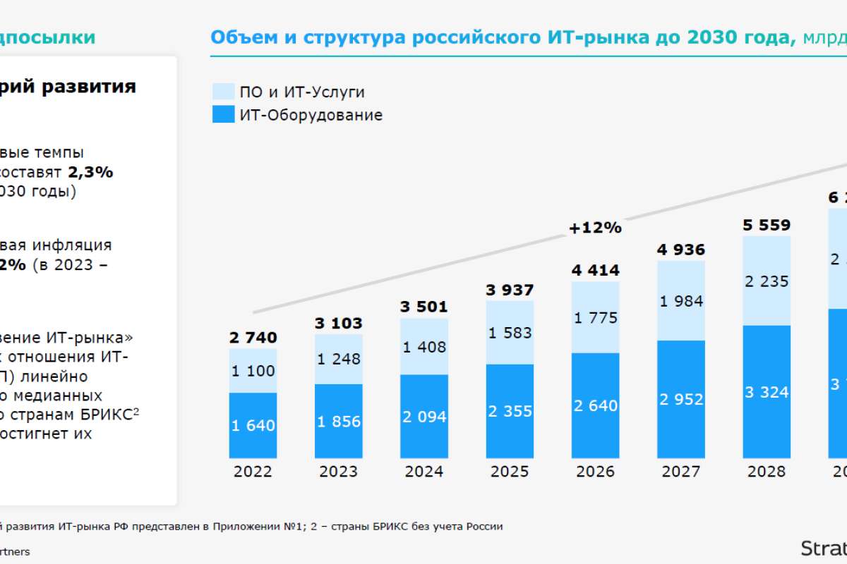 2019–2022 годах среднегодовой темп роста российского ИТ-рынка составил 12% в долларовом выражении. Это значительно выше темпов роста мирового ИТ-рынка, который увеличивался в среднем на 5% в год. Самым быстрорастущим сегментом российского ИТ-рынка стало программное обеспечение и ИТ-услуги: среднегодовой темп роста составил 19,4%. - Российский ИТ-рынок будет расти в среднем на 12% в год и достигнет 7 трлн рублей к 2030 году. Из них почти 3 трлн рублей будет приходиться на сегмент ПО и ИТ-услуг, рост которого составит 12,5% за аналогичный период.