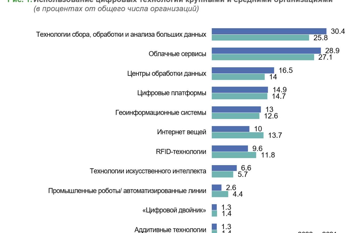 Практически во всех отраслях, как и в целом по экономике, самыми распространенными являются технологии сбора, обработки и анализа больших данных и облачные сервисы.
