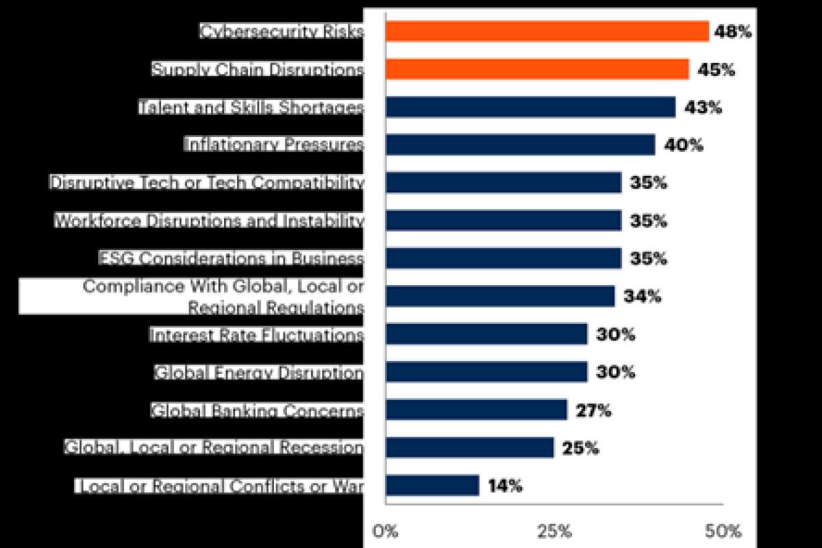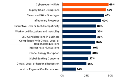 В опросе руководителей групп I&O риски кибербезопасности названы главной внешней угрозой, мешающей росту организаций в этом году. На втором и третьем месте стоят нарушение цепочек поставок и дефицит специалистов и навыков соответственно, а сразу следом идет инфляционное давление (см. рис. 1).