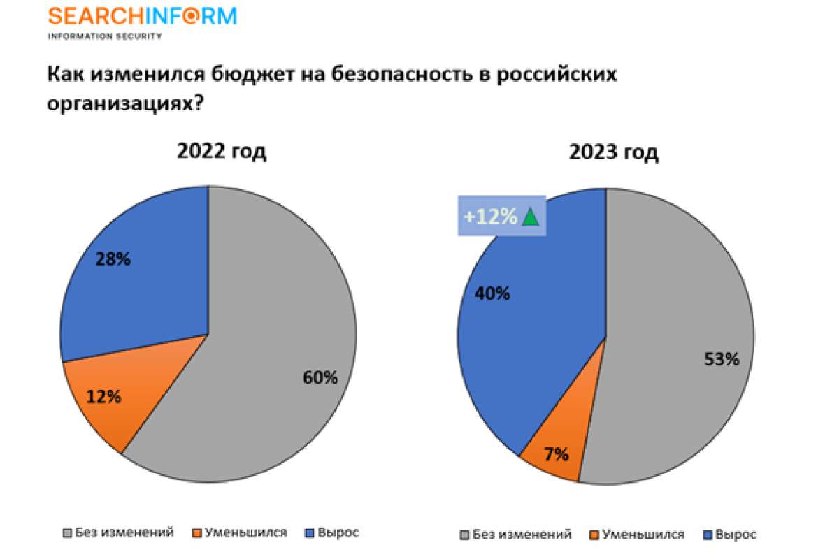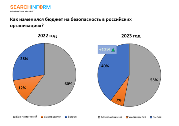 В 2023 году 40% российских компаний увеличили бюджеты на информационную безопасность, в 2022 году этот показатель составил 28%, согласно результатам ежегодных исследований компании «СёрчИнформ» среди ИБ-специалистов и ИБ-директоров российских компаний. (Рис. 1)