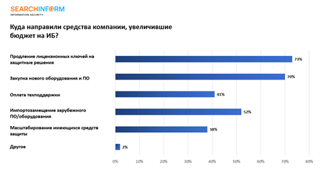 Эксперты выяснили, куда направляли средства компании, увеличившие бюджеты в 2023 году. Топ-3 ИБ-мер: продление лицензионных ключей на защитные решения (73%), закупка нового оборудования и ПО (70%) и импортозамещение зарубежных решений (52%).* (Рис. 2)