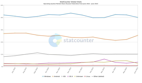 Согласно данным компании Statcounter, собирающую статистику по трафику в интернете без использования искусственных весовых коэффициентов, в июне 2023 года доля пользователей отечественных операционных систем на базе Linux составляет 2,1%, оставаясь таким же низким в отличие от лидирующих позиций Windows.