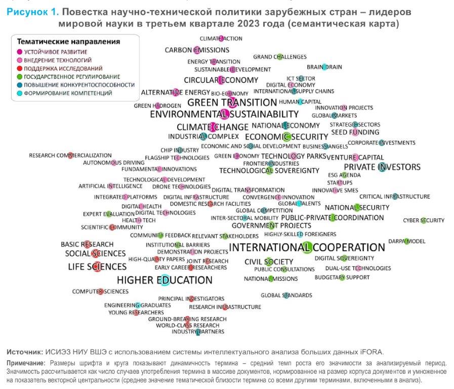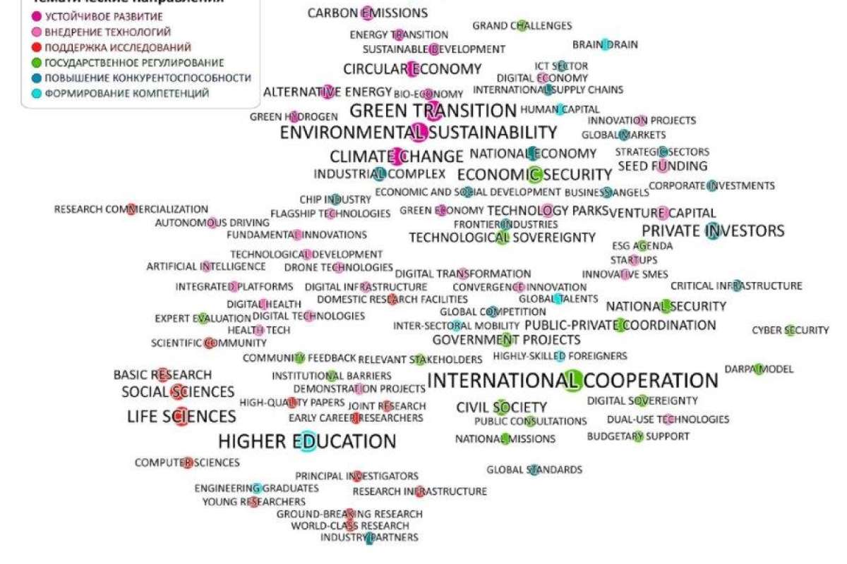 В третьем квартале 2023 года иерархия приоритетов научно-технической политики в мире, наблюдавшихся в первом полугодии, претерпела некоторые изменения, преимущественно под влиянием внешних факторов. Обращает на себя внимание возросшая близость тематик друг к другу на семантической карте (рис. 1), что свидетельствует об их усилившейся взаимосвязи — присутствии в одних и тех же либо содержательно близких документах.