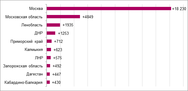 В 33 регионах количество открытых компаний превысило число закрытых. Наибольший прирост отмечался в Москве (в столице открылось на 18,2 тыс. компаний больше, чем закрылось), Подмосковье (+4,8 тыс.), Ленинградской области (+1,9 тыс.), ДНР (+1,3 тыс.), Приморском крае (+712), Калмыкии (+623), ЛНР (+575), Запорожской области (+492), Дагестане (+447) и Кабардино-Балкарии (+430).