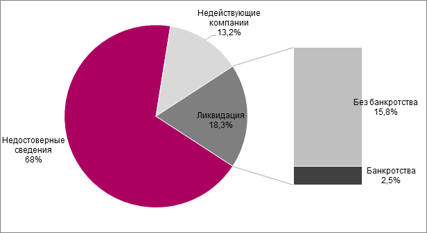 Наконец, 46,5 тыс. компаний (18,3%) были официально ликвидированы по инициативе учредителей, в том числе 6,2 тыс. (2,5%) прошли через процедуру банкротства. Процесс добровольной ликвидации юридического лица предусматривает урегулирование расчетов со всеми контрагентами и государством. К банкротству прибегают, когда у компании недостаточно средств для погашения всех долгов.