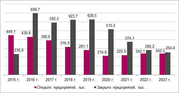В 2023 году количество закрытых коммерческих предприятий уменьшилось по сравнению с 2022 годом на 9,3%, до 254 тыс. — это рекордно низкий показатель за прошедшие 8 лет, подсчитала аналитическая служба аудиторско-консалтинговой сети FinExpertiza на основе данных ФНС. Численность же открытых компаний почти не изменилась, составив 242,5 тыс., и впервые за последние годы практически уравнялась с ликвидированными. Снижение смертности бизнеса связано с завершением основного этапа очистки госреестра от фиктивных компаний.