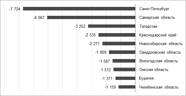Однако в большинстве регионов бизнес все-таки чаще закрывался. Наибольшая убыль компаний произошла в Санкт-Петербурге (—7,7 тыс.), Самарской области (—6,1 тыс.), Татарстане (—3,3 тыс.), Краснодарском крае (—2,5 тыс.), Новосибирской области (—2,3 тыс.), Свердловской области (—1,8 тыс.), Вологодской области (—1,6 тыс.), Омской области (—1,5 тыс.), Бурятии (—1,4 тыс.) и Челябинской области (—1,2 тыс.).