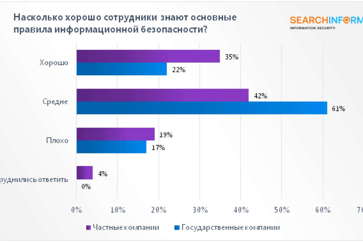 В 19% ИТ-компаний у сотрудников низкий уровень знаний основ информационной безопасности. Об этом говорят данные исследования уровня ИБ за 2023 год, проведенные «СёрчИнформ» в организациях России. В частных ИТ-компаниях больше сотрудников с хорошим уровнем знаний основ, чем в государственных — работники используют сильные пароли, не предоставляют коллегам доступ к своим учеткам и пр. Однако общий уровень подготовки у них хуже. (рис. 1)