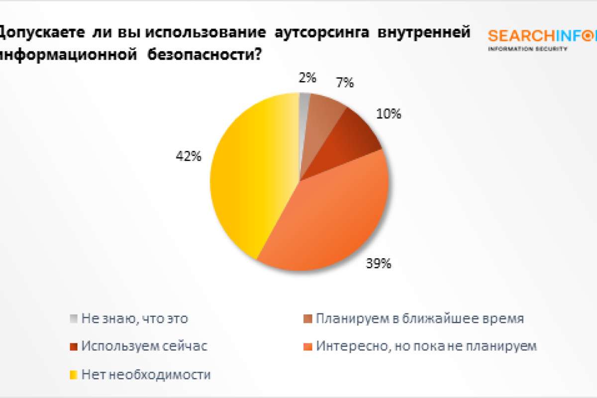 7% организаций еще не используют аутсорсинг внутренней ИБ, но планируют к ним присоединиться. Еще 39% компаний выразили интерес к услуге, но пока не планируют использовать. Чаще всего сомнения связаны с тем, что конфиденциальные данные могут стать доступны третьем лицам (76%), половина компаний беспокоятся из-за высокой стоимости услуг, треть (33%) — бояться утратить контроль за ИБ.