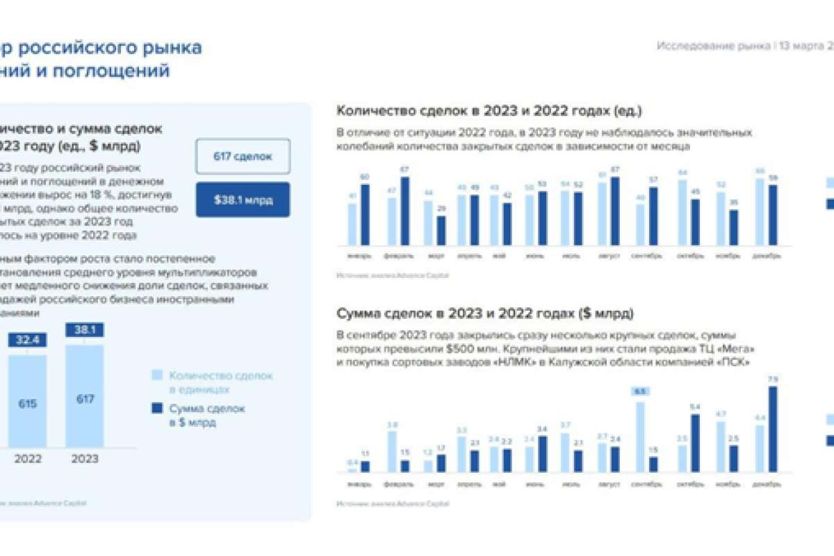 Количество M&A-сделок по итогам 2023 года почти не изменилось, но в денежном выражении рынок вырос на 18% с 32.4 млрд долл. до 38.1 млрд долл, свидетельствуют данные исследования Независимого инвестиционного банка Advance Capital. При этом количество сделок с продажей иностранного бизнеса снизилось до минимального с апреля 2022 г. уровня и продолжит сокращаться в дальнейшем.