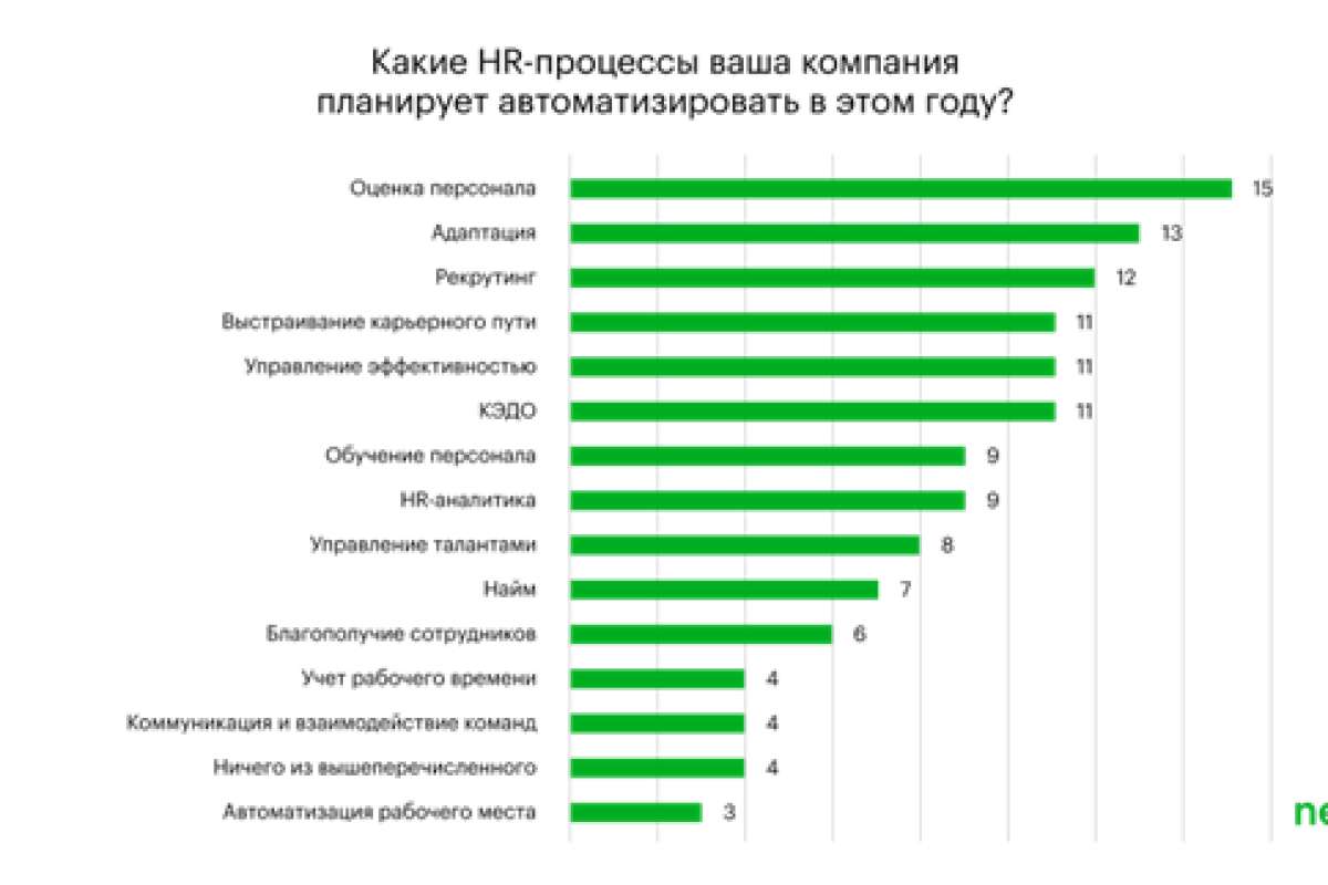 Следом идут планы по автоматизации карьерного развития, управления эффективностью сотрудников и КЭДО. Также компании заинтересованы в автоматизации корпоративного обучения, HR-аналитики, найма и программ благополучия сотрудников. (рис. 1)