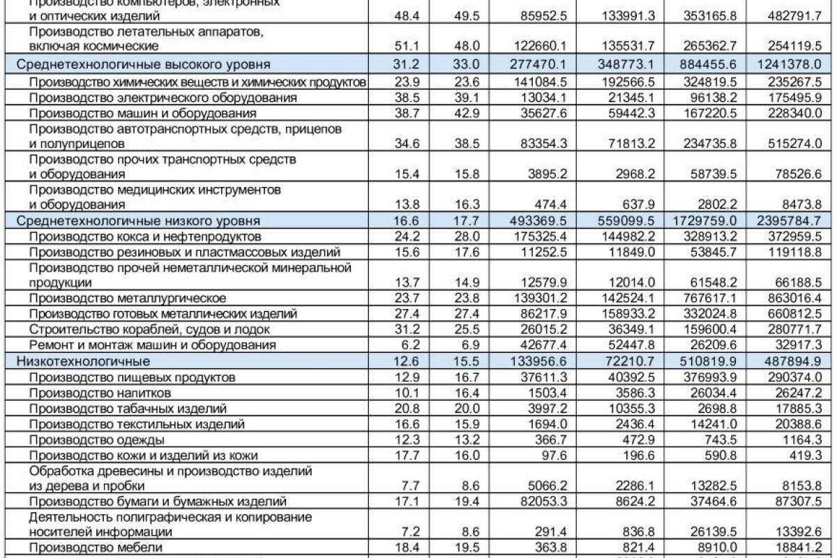 Максимальные значения доли инновационной продукции — в строительстве кораблей, судов и лодок (35,4%), производстве автотранспортных средств (25,3%), летательных и космических аппаратов (24,8%), компьютеров (23,8%), готовых металлических изделий (17,4%), медицинских инструментов и оборудования (16,4%).