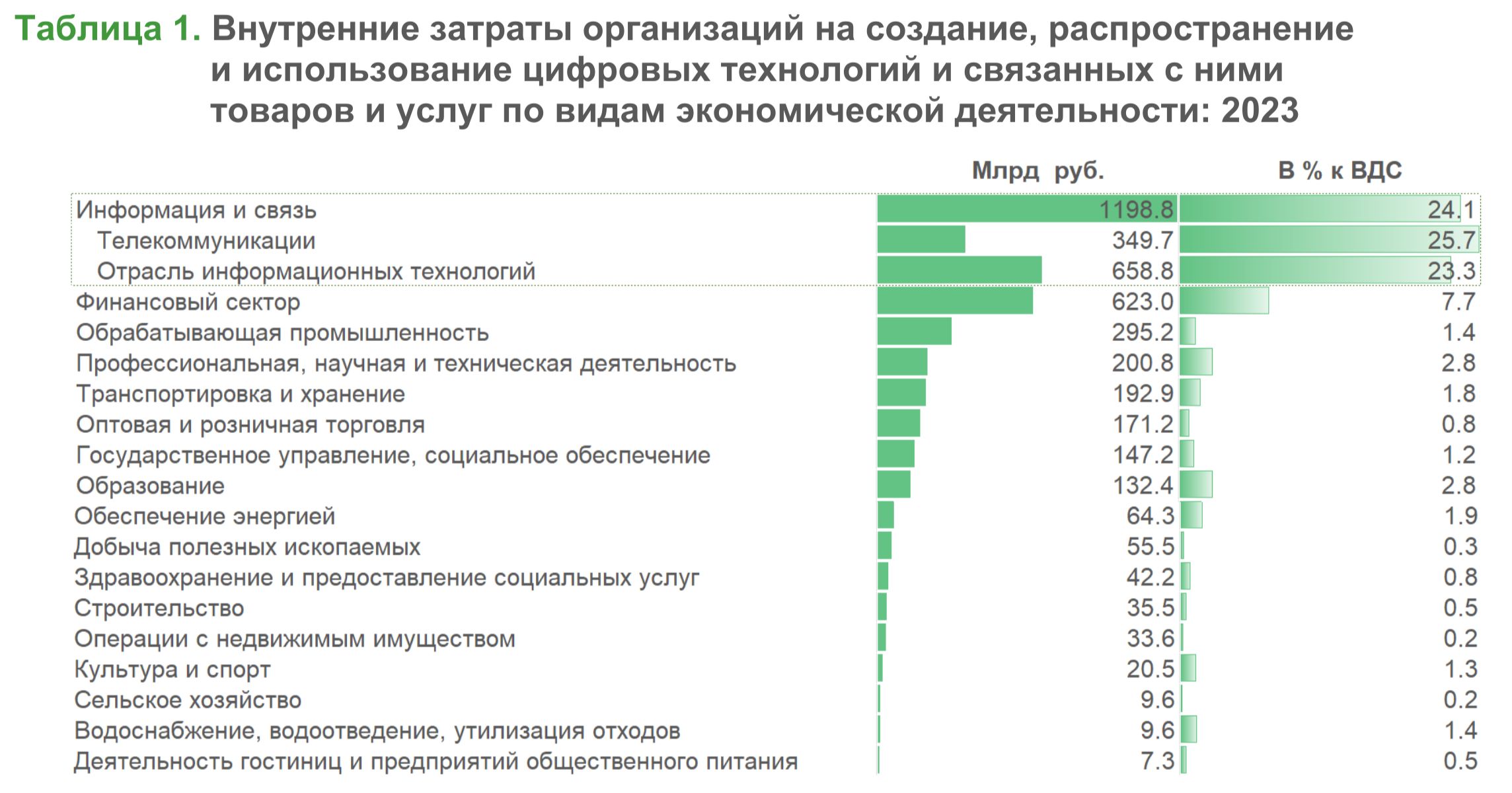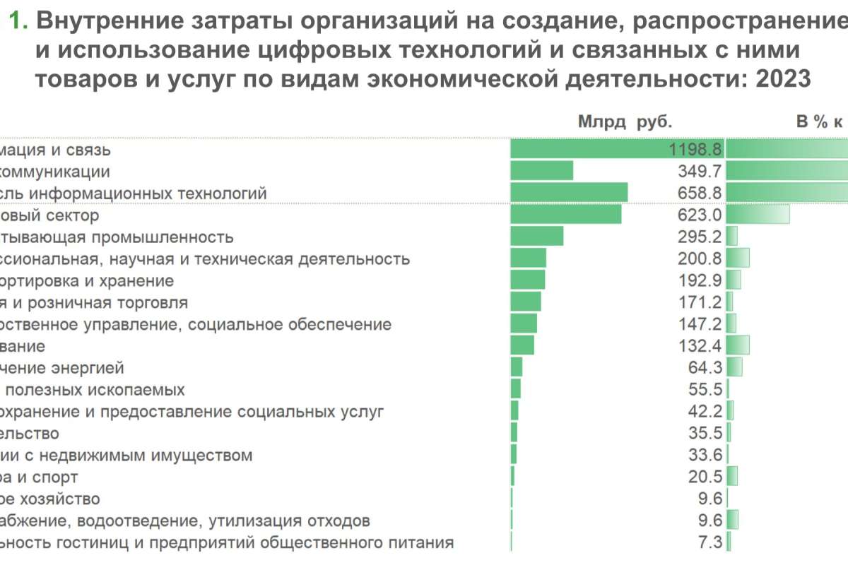 Более трети (36%) объема внутренних затрат организаций на создание, распространение и использование цифровых технологий и связанных с ними продуктов и услуг обеспечивают «цифровые» отрасли и прежде всего отрасль ИТ.