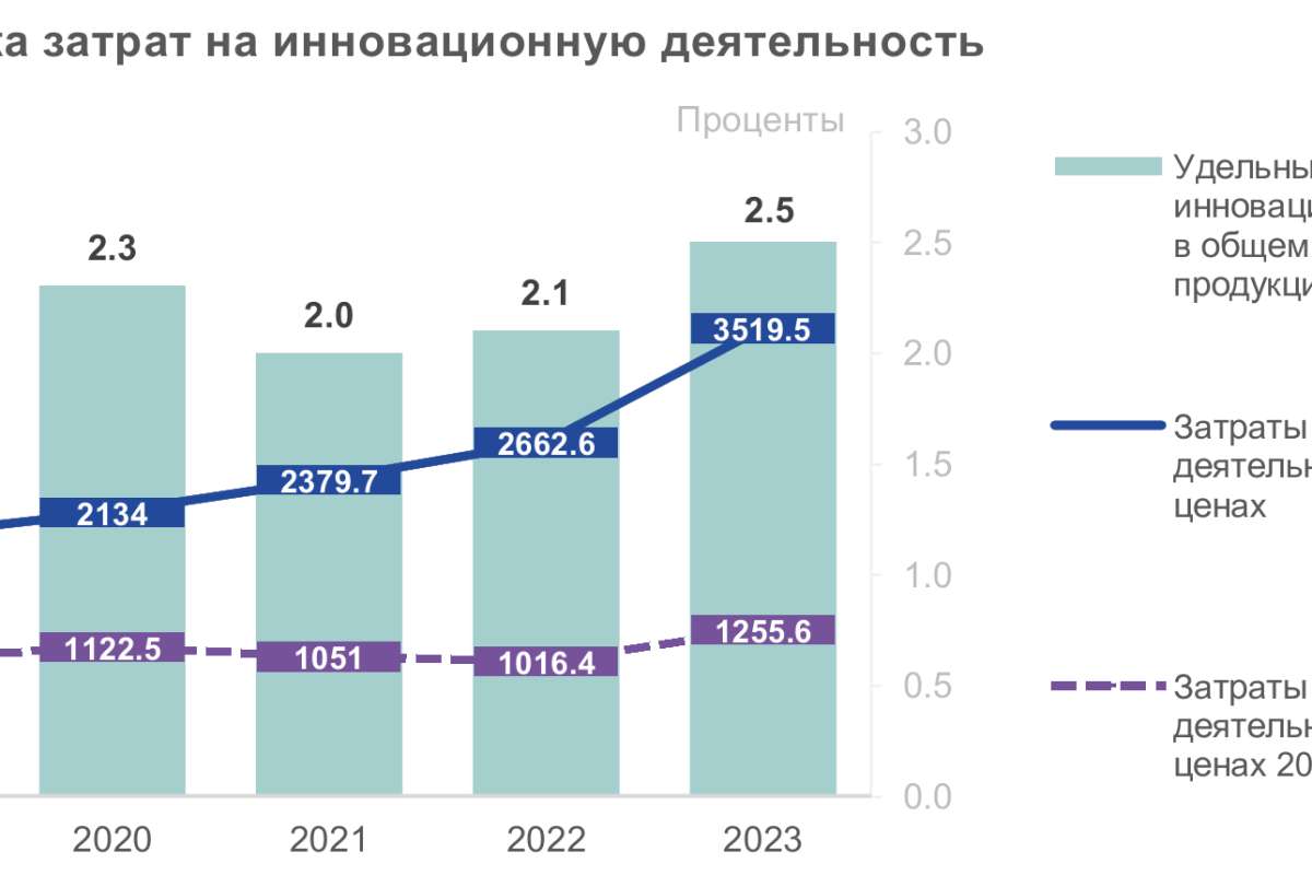 В 2023 г. сохранился тренд на увеличение затрат на инновационную деятельность как в текущих ценах, так и в постоянных (с учетом инфляции) (рис. 1). Объем инвестиций в инновации российских организаций достиг 3,5 трлн руб., что на 23% выше показателя 2022 г. и в 1,2 раза — его значения в 2019 г. (в постоянных ценах). Интенсивность инновационных расходов (т. е. отношение затрат к общему объему отгруженной продукции) составила 2,5%, увеличившись по сравнению с 2022 г. на 0,4 процентных пункта.