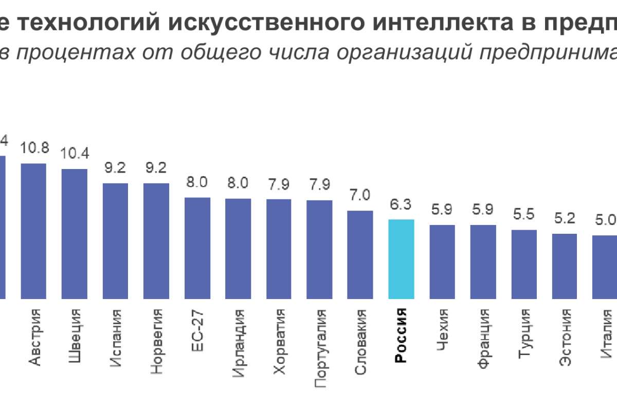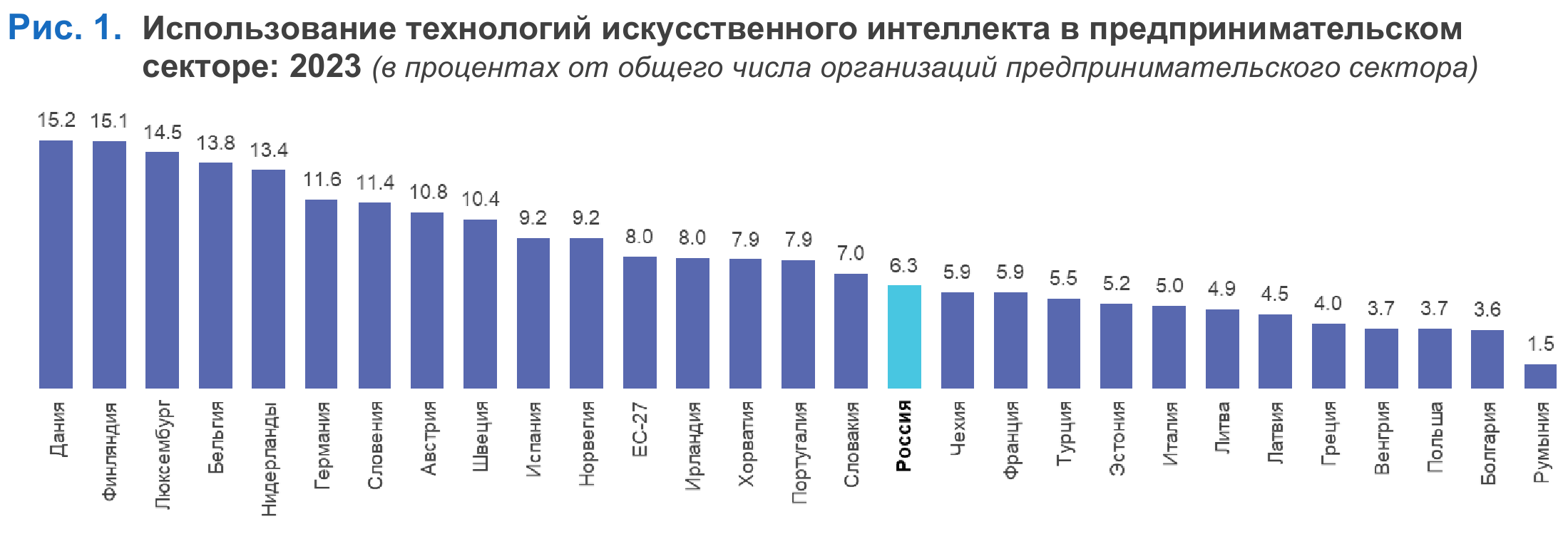 В России удельный вес организаций предпринимательского сектора, использующих технологии ИИ, в 2023 г. составил 6,3%, что лишь на 1,7 п. п. ниже среднего значения по странам — членам ЕС. В пятерку лидеров вошли Дания (15,2%), Финляндия (15,1%), Люксембург (14,5%), Бельгия (13,8%) и Нидерланды (13,4%). В числе стран с уровнем показателя ниже российского — Чехия, Франция, Италия, Польша (рис. 1).