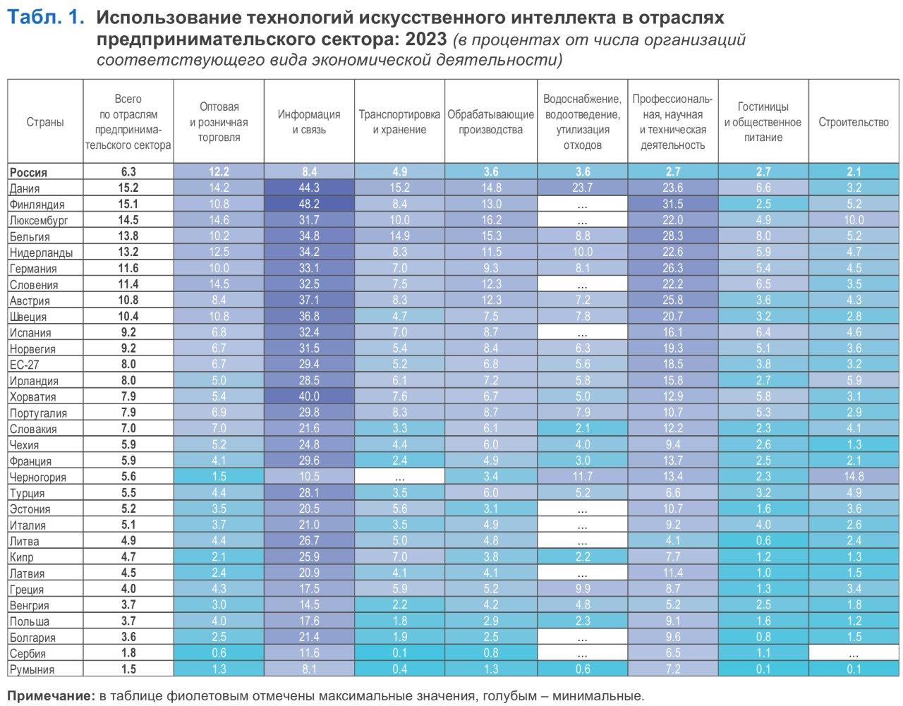 В пределах ЕС разница между отраслями с максимальным (информация и связь) и минимальным (строительство) значением доли организаций, применяющих ИИ, составляет 26,2 п. п. В странах — лидерах по использованию ИИ разрыв еще заметнее. Например, в Финляндии он достигает 45,7 п. п., в Дании — 41,1 п. п., в Люксембурге — 26,8 п. п. В России доля пользователей ИИ распределена по рассматриваемым отраслям предпринимательского сектора более равномерно: разница составляет 10,1 п. п.