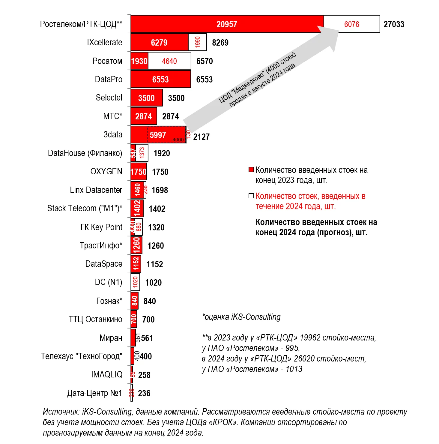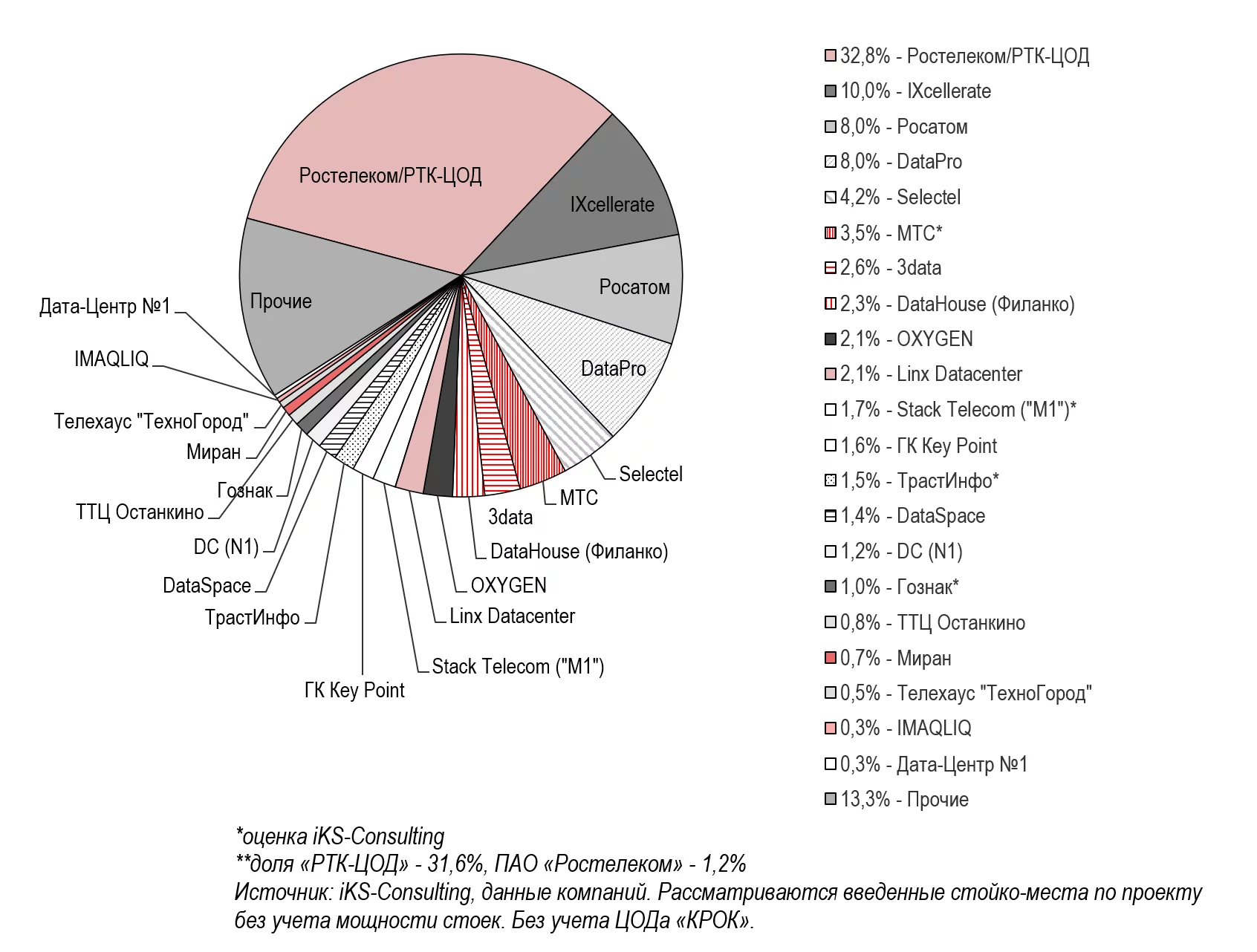 Лидером по числу введенных в эксплуатацию стойко-мест в 2023 году остается группа компаний «Ростелеком/РТК-ЦОД», в числе ключевых объектов которой комплекс ЦОДов NORD, Москва