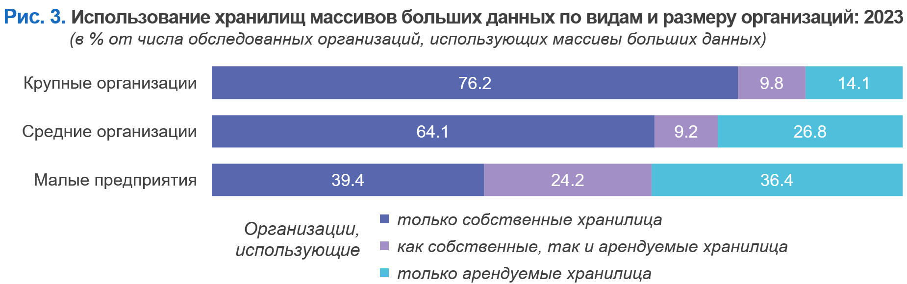 Массивы больших данных могут храниться с использованием как собственных, так и арендуемых мощностей. Результаты обследования показали, что большинство работающих с МБД организаций полагаются только на собственные хранилища. Прежде всего это относится к крупным (76,2%) и средним (64,1%) компаниям — пользователям МБД. Среди малых предприятий эта доля намного ниже — 39,4% (рис. 3).
