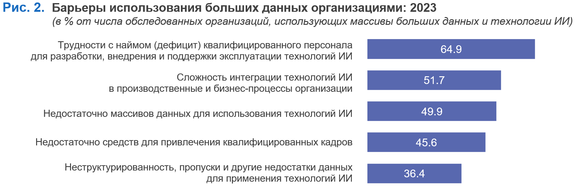 Использование МБД для работы с технологиями ИИ сдерживается целым рядом факторов. Наиболее значимые среди них — дефицит квалифицированного персонала в предметной области (выделяют 64,9% обследованных организаций, задействовавших ИИ и МБД), сложности интеграции технологий ИИ в производственные и бизнес-процессы (51,7%), нехватка массивов данных для использования ИИ (49,9%). Примечательно, что недостатки данных для применения технологий ИИ (неструктурированность, пропуски и др.) упоминаются реже всего: эту проблему отметили 36,4% организаций — пользователей ИИ и МБД (рис. 2).