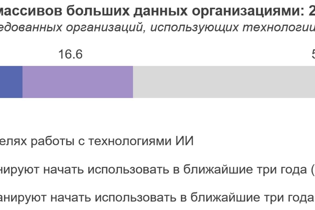 Показательно, что 4,6% обследованных организаций, использующих в своей деятельности МБД, не занимаются аналитикой больших данных. Причина здесь — как в отсутствии нужных ресурсов и навыков, так и в неочевидности для компаний дополнительных бизнес-эффектов от проведения подобной аналитики. Для этого пула организаций катализатором повышения эффективности работы с данными могут стать именно технологии искусственного интеллекта. На стыке ИИ-решений и инструментов анализа МБД формируются возможности не только эффективной обработки данных, но и их преобразования в ценные новые знания, обеспечивающие принятие взвешенных управленческих решений, оптимизацию бизнес-процессов, ускорение инноваций, что в будущем может привести к трансформации целых отраслей.