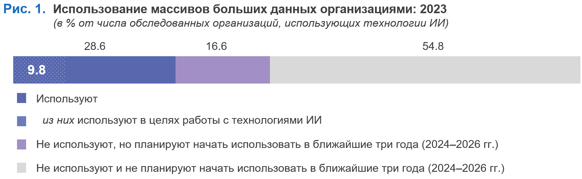 В какой мере большие данные востребованы российскими компаниями для работы ИИ? Результаты специализированного обследования показали, что среди организаций, работающих с технологиями искусственного интеллекта, 28,6% используют в своей деятельности массивы больших данных и только 9,8% применяют МБД именно в целях работы с ИИ (рис. 1).