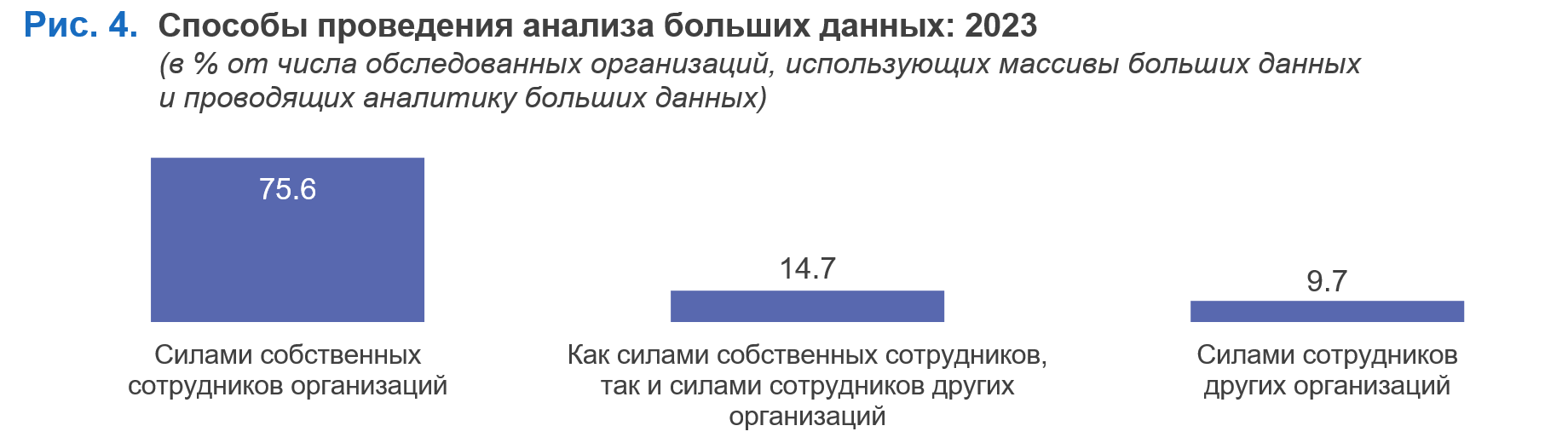 Подавляющее большинство (75,6%) опрошенных организаций, использующих МБД, имеют в штате кадры, обладающие соответствующими компетенциями, и проводят аналитику больших данных силами своих сотрудников, не доверяя ее внешним контрагентам. Еще 14,7% испытывают нехватку внутренних ресурсов и привлекают как собственных сотрудников, так и специалистов других компаний. Полностью делегируют аналитику больших данных сторонним фирмам только 9,7% респондентов, что может свидетельствовать как о недостаточном уровне компетенций в организациях, так и об осознанной стратегии привлечения специализированных кадров, развитие которых внутри компании нецелесообразно (рис. 4).