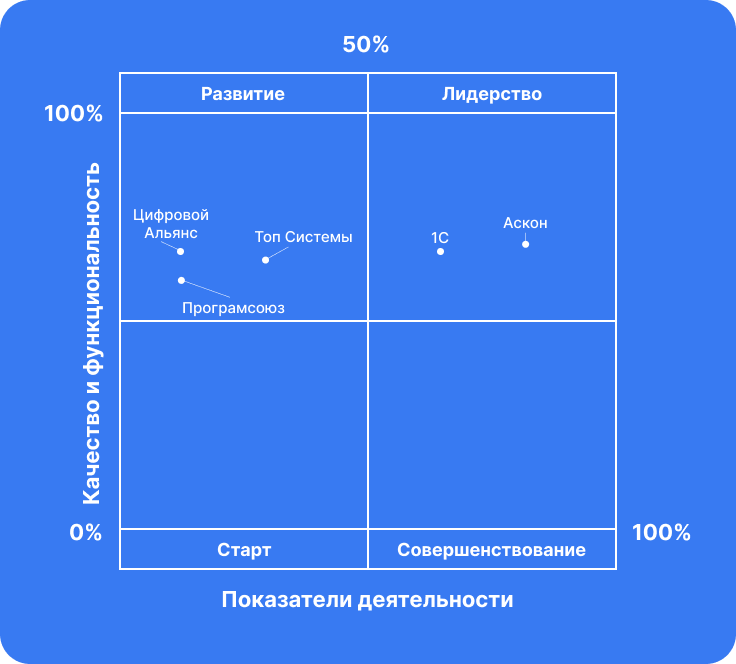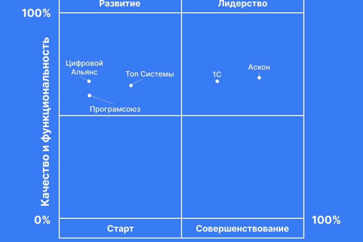 Лидерами российского рынка PLM являются «Аскон» и 1С. В квадранте «Развитие» фигурируют три вендора, предлагающие PLM-продукты: «Топ Системы», «Цифровой альянс», «Програмсоюз». Наличие сразу трех вендоров в данном квадранте является показателем готовности к конкуренции на рынке цифровой продукции. А это, в свою очередь дает лидерам повод работать над совершенствованием своих продуктов.